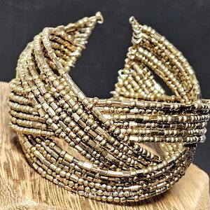 Vtg Metallic Bronze Gold Y2K 90s Striped Pretzel Memory Wire Cuff Bead Bracelet