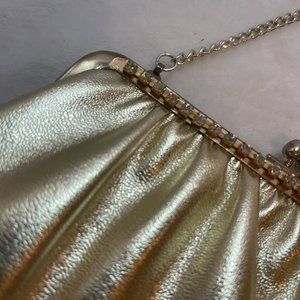 Elevate your formal look with this vintage metallic gold clutch purse. The clutch, with a metal snapkiss close, comes with a chain for versatility in styling. The gold color and eveningwear look make it perfect for adding a touch of glam to any outfit.