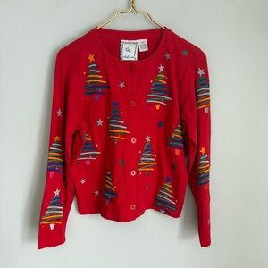 Vtg Michael Simon Christmas tree embroidered button up cotton cardigan red
