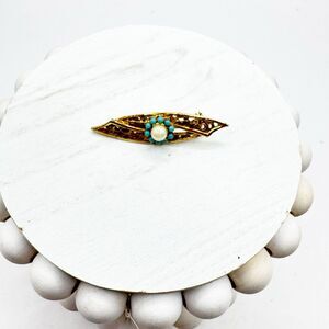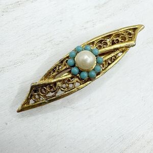 Vtg Mid Century MCM Faux Pearl And Turquoise Gold Tone Filigree Bar Pin Brooch