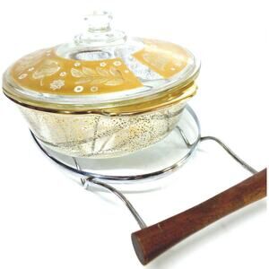 This Mid-Century Casserole Dish Features Gold Leaves & White Flowers On The Lid and Speckled Gold Bowl - Metal Stand Has Wooden Handles!