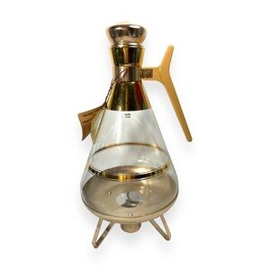 Vtg Mid-Century INLAND Glass Carafe & Warmer 22k Gold Trim Coffee Pot Cork Lid