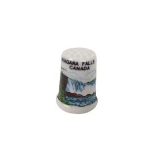 This charming mid-century kitschy souvenir set for Niagara Falls includes a Cameo brand silver-plated spoon and white ceramic thimble. The 4-1/4" spoon features an image of the Maid of the Mist, while the 1-1/8" tall thimble is marked "Niagara Falls Canada". The spoon comes with the original box, Sigal Brothers Ltd, Windsor Canada.