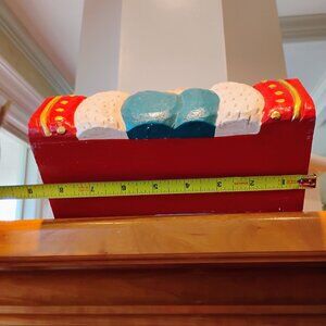 This charming Vintage Folk Art Christmas Decor features a Santa Claus letter box card holder, perfect for adding a festive touch to your home. Its original tag is included, making it a unique collectible piece for the holiday season.