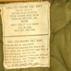 Has removeable liner--Liner Cold Weather Coat Man's DSA-74-C-0174--Batting 100% polyester, Outer Covering 100% nylon, Gibraltrar Industries, Inc., Medium (best guess on the letters and numbers)