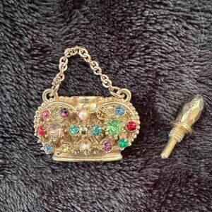 This is a darling vintage miniature perfume bottle, decorated with colorful rhinestones. It has an attached chain, with the screw on dauber which easily opens and closes. It is exactly as pictured. Please ask me anything.