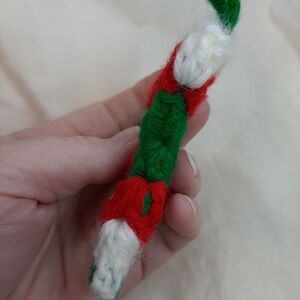 Miniature (approx. 3") handmade knit crochet Christmas stocking - ornament sized. Green, red & white granny square design.