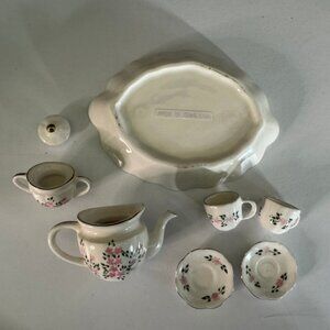 Vtg Miniature 8 Piece Porcelain Tea Set -White with Pink Floral Design