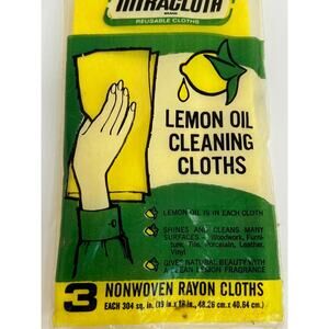 The product is a pack of 3 vintage Miracloth cleaning cloths in a yellow color. Made of rayon material, these reusable cloths are perfect for dusting tasks around the home. Manufactured in the United States, this NOS (New Old Stock) pack of cleaning cloths is a rare find for collectors or anyone looking for high-quality, durable cleaning supplies.