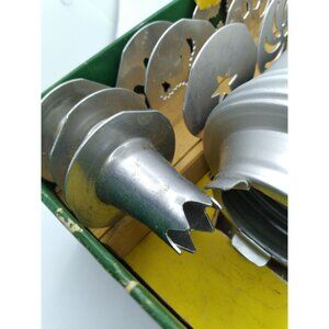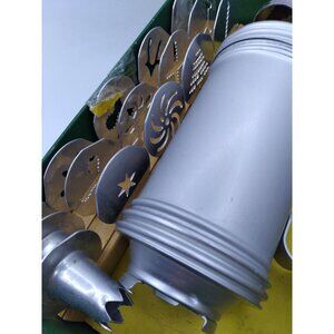 Vintage Mirro Cookie And Pastry Press Aluminum in original box with 12 discs and 3 tips. Pre owned good vintage conditio with wear to box noted. Also wear to finish on pipe/press. Does not include any other accessories. What you see is what you will get.