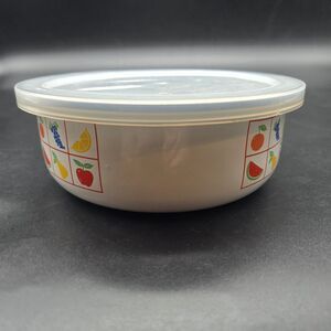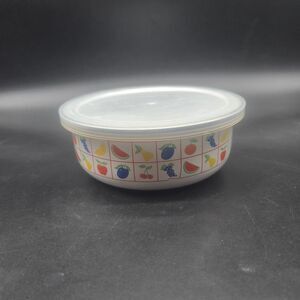 Vtg. Mixed Fruit Metal Enamel Storage Bowl With Lid Colorful Red, Blue, Yellow