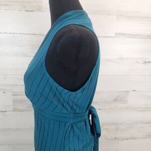 • The faux wrap-front design and sleeveless silhouette create a flattering fit, cinched at the waist with a matching fabric tie for a chic, tailored look.