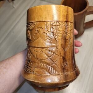 Beautifully carved wooden mugs with intricate designs. Perfect for rustic decor or gifting.