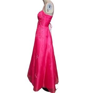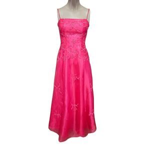 Beautiful hot pink y2k 90s era formal dress. Lined in tule for added fullness. The sheer Netting overlay has beautiful floral leaves beading using clear beads. The straight neckline and very strappy laced back in classic vintage design. Shoulder straps have been altered. UNIQUE for prom!