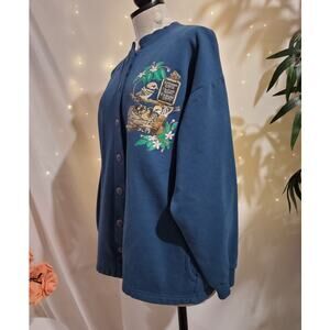 Vtg Morning Sun Bird Button Up Sweatshirt Womens Size L Granny Blue Pockets