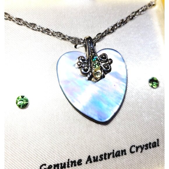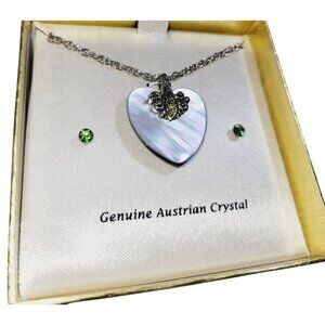 This elegant vintage set features a mother of pearl heart pendant with Austrian crystal accents paired with matching crystal earrings. A timeless gift piece.