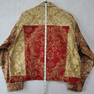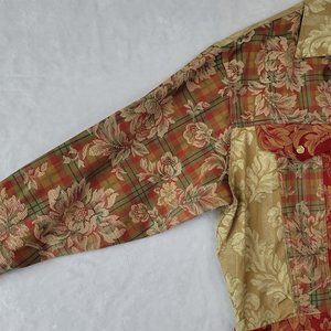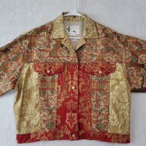 Vintage My Boyfriends Back of Santa Monica California Women’s Denim Jacket One Size. (Would Fit About Like A LG) Red & Gold Floral Patchwork And Plaid Pattern Silk Acetate Accents Inside. Absolutely Beautiful. (If It Were My Size I Would Keep It.)