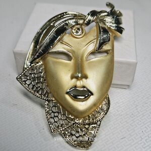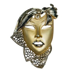 Add a touch of drama and intrigue to your collection with this vintage 3D hollow opera mask brooch in a matte satin gold tone.