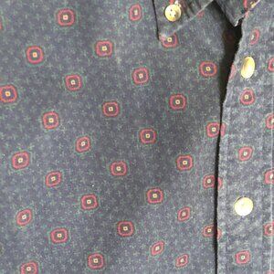 This is a high-quality, long-sleeve button-down shirt from Nautica, featuring a classic vintage feel and construction. Size Medium and has a single chest pocket. The shirt has a Dark Navy blue background with an intricate repeating geometric or medallion pattern in Red and Forest Green. Features a desirable "Made in USA of Imported Fabric" tag, which points to an older, high-quality garment. The 100% cotton fabric has a soft, almost flannel-like or brushed feel.
