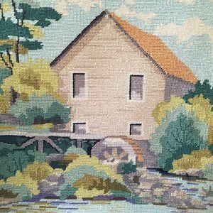 Vtg NEEDLEPOINT Tapestry- Cottage and Water Mill
