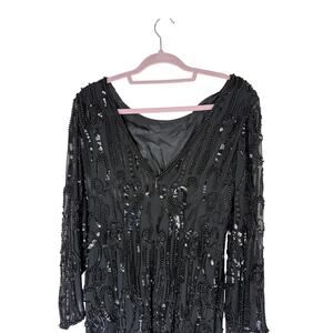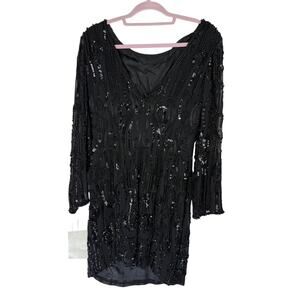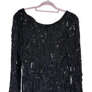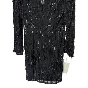 Vtg NWT Black Tie Oleg Cassini Black Beaded Long Sleeve Deep Back V Dress Size 8