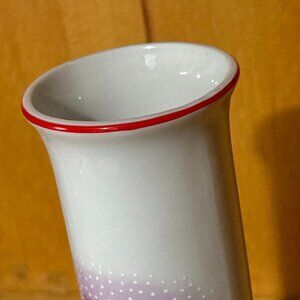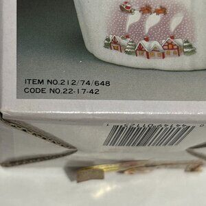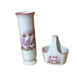 This fine porcelain set includes a bud vase and basket, both adorned with charming holiday scenes.