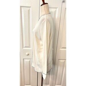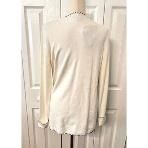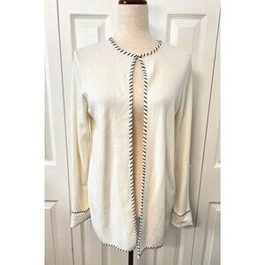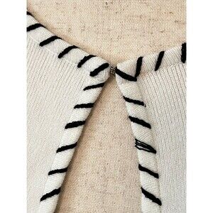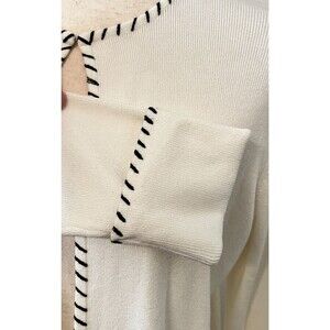 Beautiful classy cardigan sweater by Sans Pareille. Vintage, deadstock, new with tags. Features a white knit rayon blend with black accent stitching along the hems. Has long sleeves and a hook and eye closure at the neck, otherwise open drape. Really pretty and well made. Comes with extra threads and hardware attached. Women's size Small.