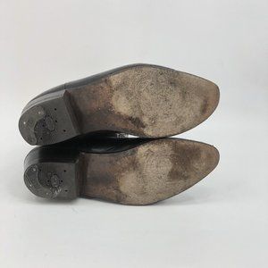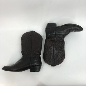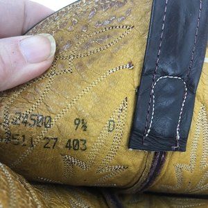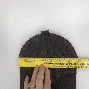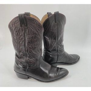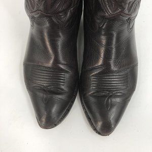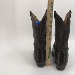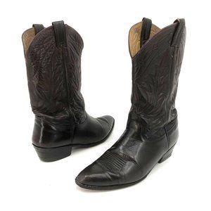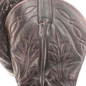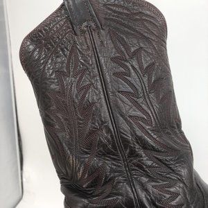 Vintage Nacona western boot, beautiful soft leather in Oxblood color with burgundy flame stitching on shaft and toe. Very good condition with heel taps applied, some usual scuffing from wear. As these are leather and preworn, some stretching may have occurred during wear.