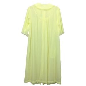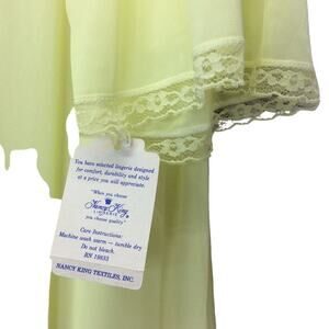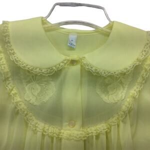 This vintage Nancy King lingerie housecoat is a stunning piece that will surely catch your eye. It features short sleeves, lace trims, and a button-front design. The beautiful yellow color is complemented by the granny core look, which will take you back to the 1970s. Made of high-quality nylon, this housecoat is in its original condition and has not been modified. The item is a size medium and is perfect for those who love collecting vintage sleepwear and robes. The product was made in the United States and is a must-have for anyone who loves vintage clothing. Get your hands on this beautiful piece today and add it to your retro collection!