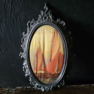 This set of two vintage oval ship prints on fabric features intricate metal frames and nautical imagery. Fabric is silk like. A timeless addition to classic or maritime-themed decor.