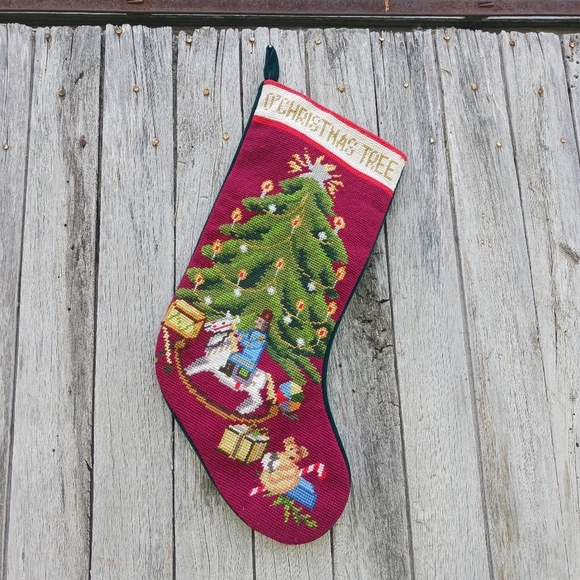 Vtg Needlepoint Christmas Holiday Stocking “O Christmas Tree” Green Velvet Back