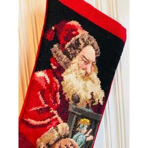This beautiful vintage needlepoint Christmas stocking features an elegant, richly detailed scene of an Old World Santa Claus with a young girl and toys. The hand-stitched needlepoint work showcases classic vintage colors, fine shading, and charming character expressions. Finished with a deep red fabric backing and a sturdy hanging loop, this stocking is designed to last for generations.