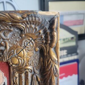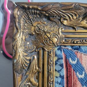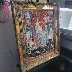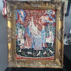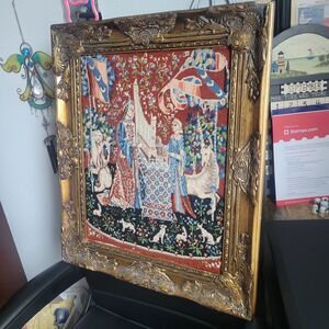 This product is a vintage handmade framed needlepoint piece depicting a medieval Renaissance scene of Lady and the Unicorn. The embroidery technique used is needlepoint, measuring 16x20 inches. This unique and intricate design would make a beautiful addition to any craft or art collection. It is framed with a beautiful ornate gold frame with an antique look