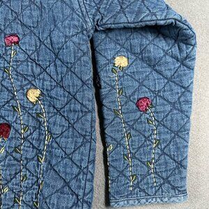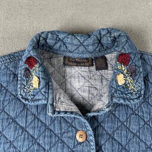 Vtg New Direction Womens L Floral Embroidered Blue Quilted Jacket Button Up
