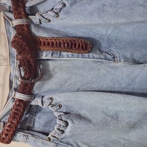 Chic denim with a stylish braided detail. Ideal for everyday wear. Ole world, high waist great grommet design on the pockets.