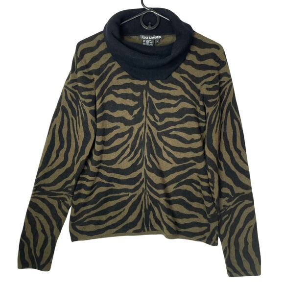 Vtg Nina Leonard Wool Angora Blend Sweater L Zebra Animal Print Cowl Neck Y2K