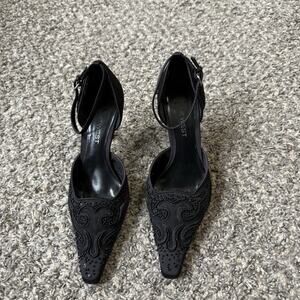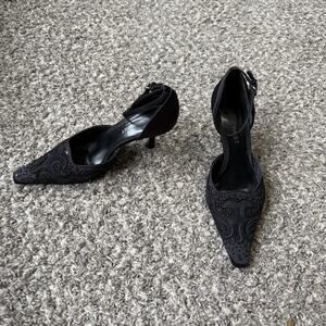 Vtg Nine West Black Kitten Heels Pointed Toe Ankle Strap Formal Beaded Y2K 7.5 M