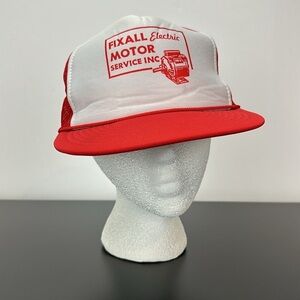 Vtg Nissin Red White Cap Trucker Hat Snap Back Fix All Electric Motor Service