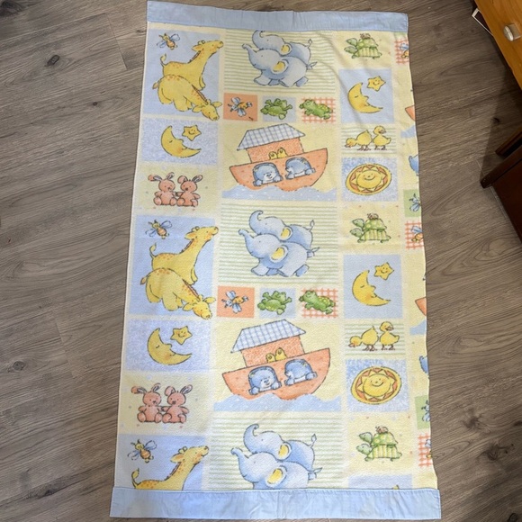 Vtg Noah's Ark Baby Travel Blanket Handmade Blue Yellow Pink Fleece 30”x53.5”