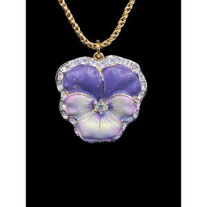Vtg. Nolan Miller Purple Pansy Pendant Necklace & Brooch Set Gold-Tone Chain Crystal Accents. Elegant Floral.This elegant floral jewelry set features a delicate purple pansy pendant necklace with a matching brooch, both adorned with crystal accents. ESTATE. In amazing vintage condition. Part of a well preserved collection.