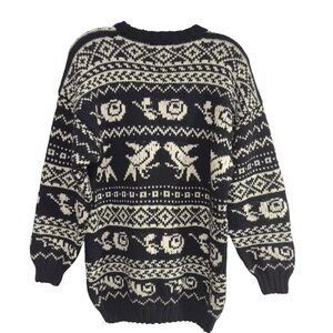 vintage wool sweater, Nomadic Traders Peru sweater, fair isle sweater, bird pattern sweater, handmade sweater, black and cream knit, cozy winter sweater, wool pullover, 80s 90s style sweater, boho wool sweater