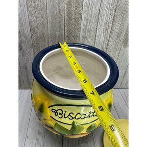 Vintage Nonni's Biscotti cookie jar with vibrant yellow fruit decor. Perfect for storing treats or adding a charming touch to your kitchen.