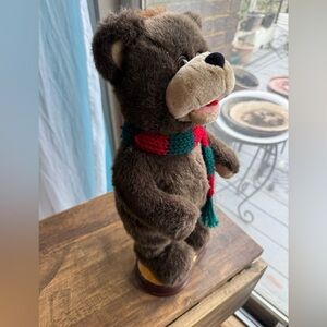 This vintage Gemmy animated Christmas bear from North Pole Productions is a must-have for any collector! Featuring a charming bear design, this 15" tall figure is perfect for the holiday season. With its music and dancing features, it will add a touch of whimsy to your festive decor.