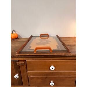 This unique vintage serving tray features an intricate inlaid wood design of the Australian continent with a kangaroo outline in the center. Handcrafted with a mix of beautiful hardwoods including Copper Oak, Amberoi, Silver Oak, and Walnut, as detailed on the handwritten label still attached to the back. The tray measures approximately 18” x 13” and includes curved wood side rails and retro-style orange resin handles. Protected with a fitted clear glass top. A stunning display piece or practical server for entertaining.
