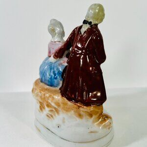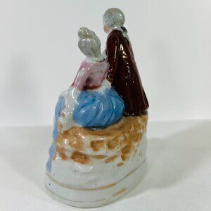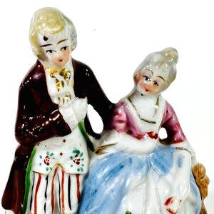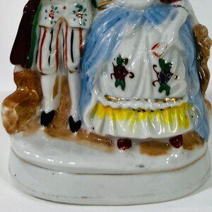 This vintage ceramic figurine depicts a beautifully hand-painted couple in traditional attire. The intricate detailing and vibrant colors make it an eye-catching decorative piece for any collection.