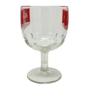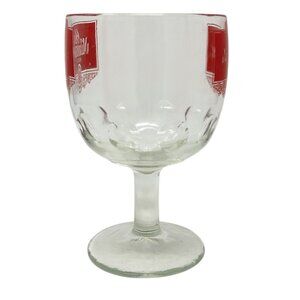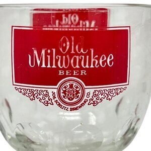 Raise your glass with this bold “Old Milwaukee / Schlitz” thumbprint goblet, featuring a vivid red logo and classic textured bubble design. This stemmed beer glass holds approximately 16 oz, with a flared bowl rising from a sturdy base. Its sculpted “thumbprint” dimple surface adds vintage character and grip, while the advertising inscription reflects mid-century flair. Perfect for collectors of retro barware or for display in a home bar, this piece blends nostalgia with functional style.