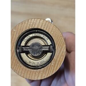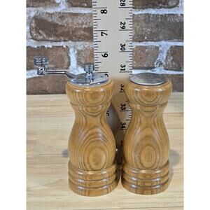 Spice up your kitchen with this vintage Olde Thompson salt and pepper set! Crafted from medium brown wood with a classic wood grain pattern, this set includes a pepper mill/grinder and salt shaker. Perfect for all occasions, this traditional style set is an original and authentic addition to your kitchen tools and gadgets. Measuring 5 1/4" in height and 2 1/4" in width, this set is a perfect medium size for any tabletop. The brown color of the set complements any kitchen decor and adds a touch of warmth. Made in the United States, this set is a must-have for any collector of kitchen accessories.