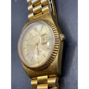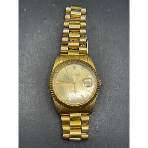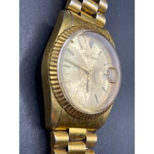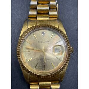 Vtg Oleg Cassini Mens 31-727DG Date Fluted Gold Tone Quartz 35mm Watch 7.5"