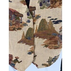 Eye-catching vintage vest with a distinct Western flair. Showcasing a unique tapestry design featuring horses, cowboys, carriages, and scenic landscapes, this vest is crafted with meticulous attention to detail. The piece is fully lined in black and includes side ties for an adjustable fit. Its classic silhouette and distinctive pattern make it a standout addition to any wardrobe. Perfect for adding a touch of Western charm to a casual outfit or for themed events, rodeos, and country-western dances.