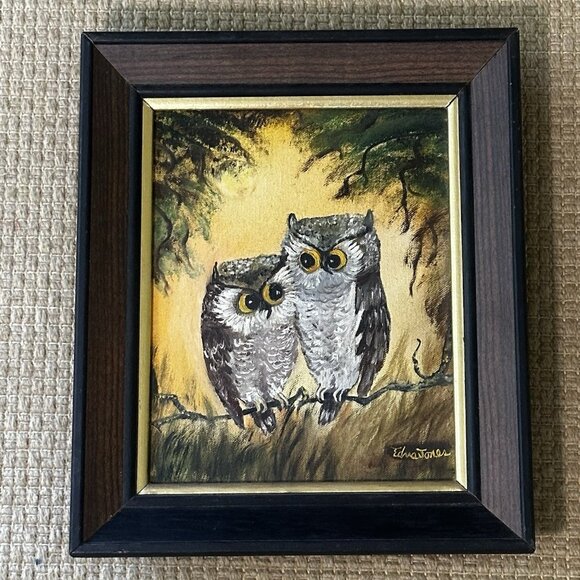 This is an original oil painting by Edna L. Jones in Jacksonville, Florida USA from the 1970’s. It features 2 owls sitting a tree in the moonlight in beautiful gold and brown tones. It is signed by the artist. The wooden frame with gold accent perfectly showcase this beautiful piece.